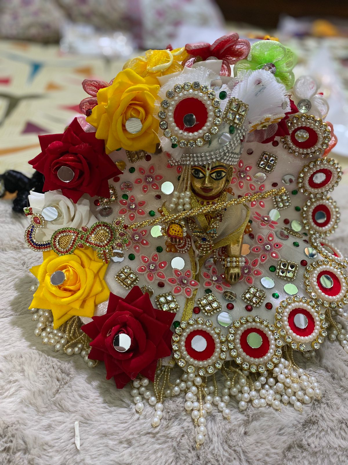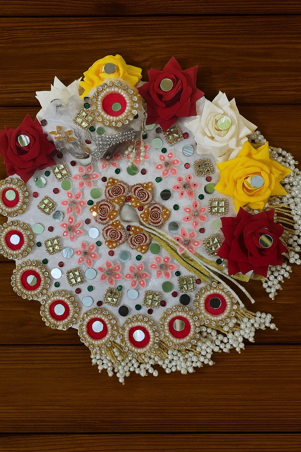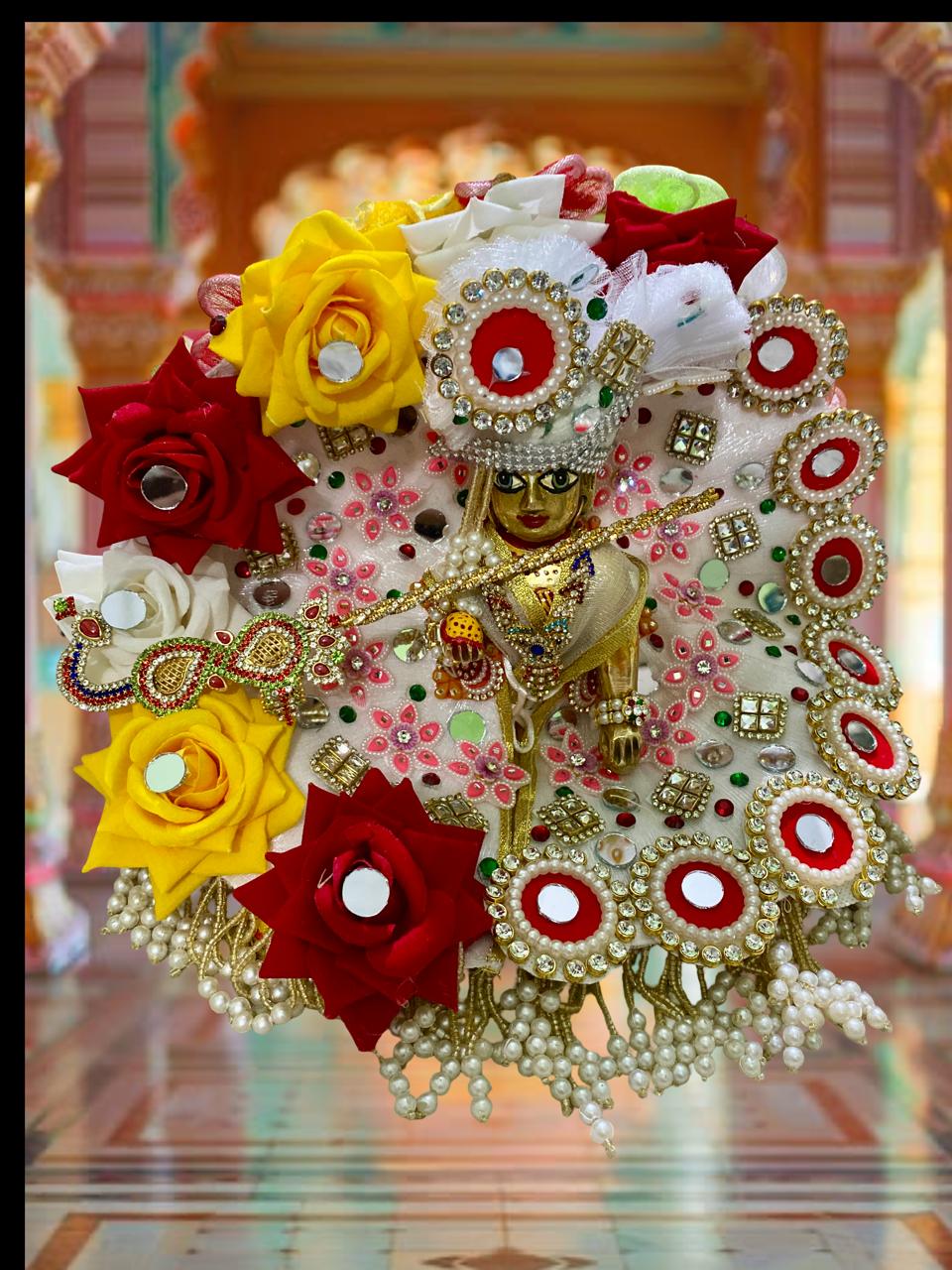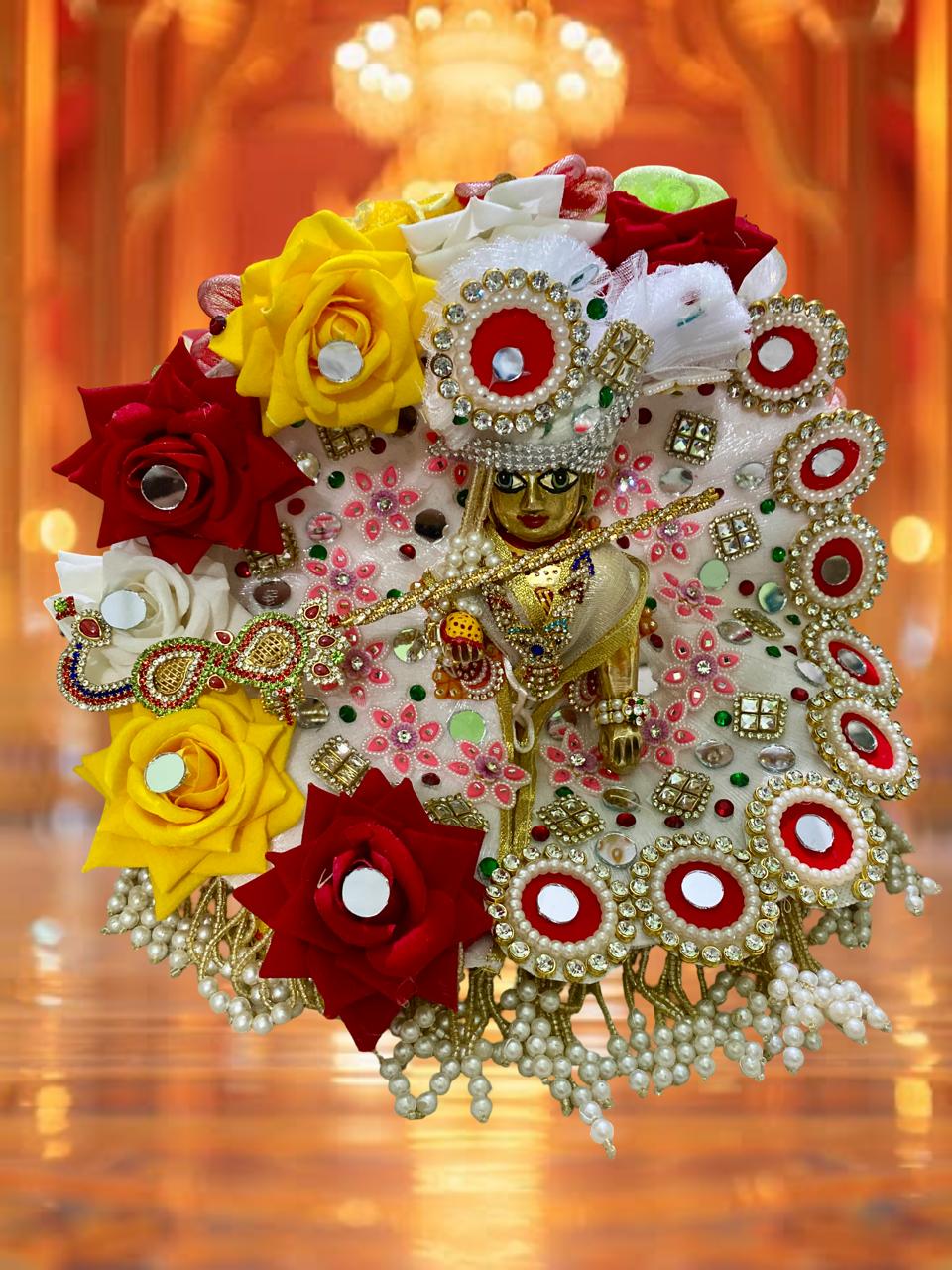 Give your Laddu Gopal an elegant and festive look with this premium handcrafted poshak. Designed with a delicate white base adorned with vibrant red, yellow, and white artificial flowers, sparkling mirror work, and dazzling stone embellishments, this attire radiates divine charm. The pearl tassel border adds a graceful finishing touch, making it perfect for Janmashtami, pooja ceremonies, or daily shringaar.