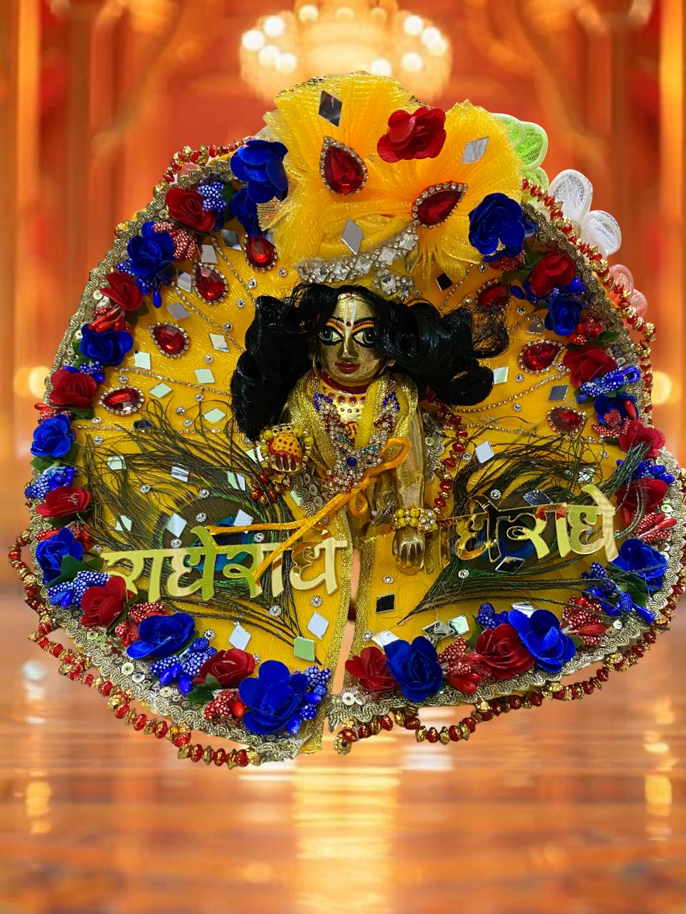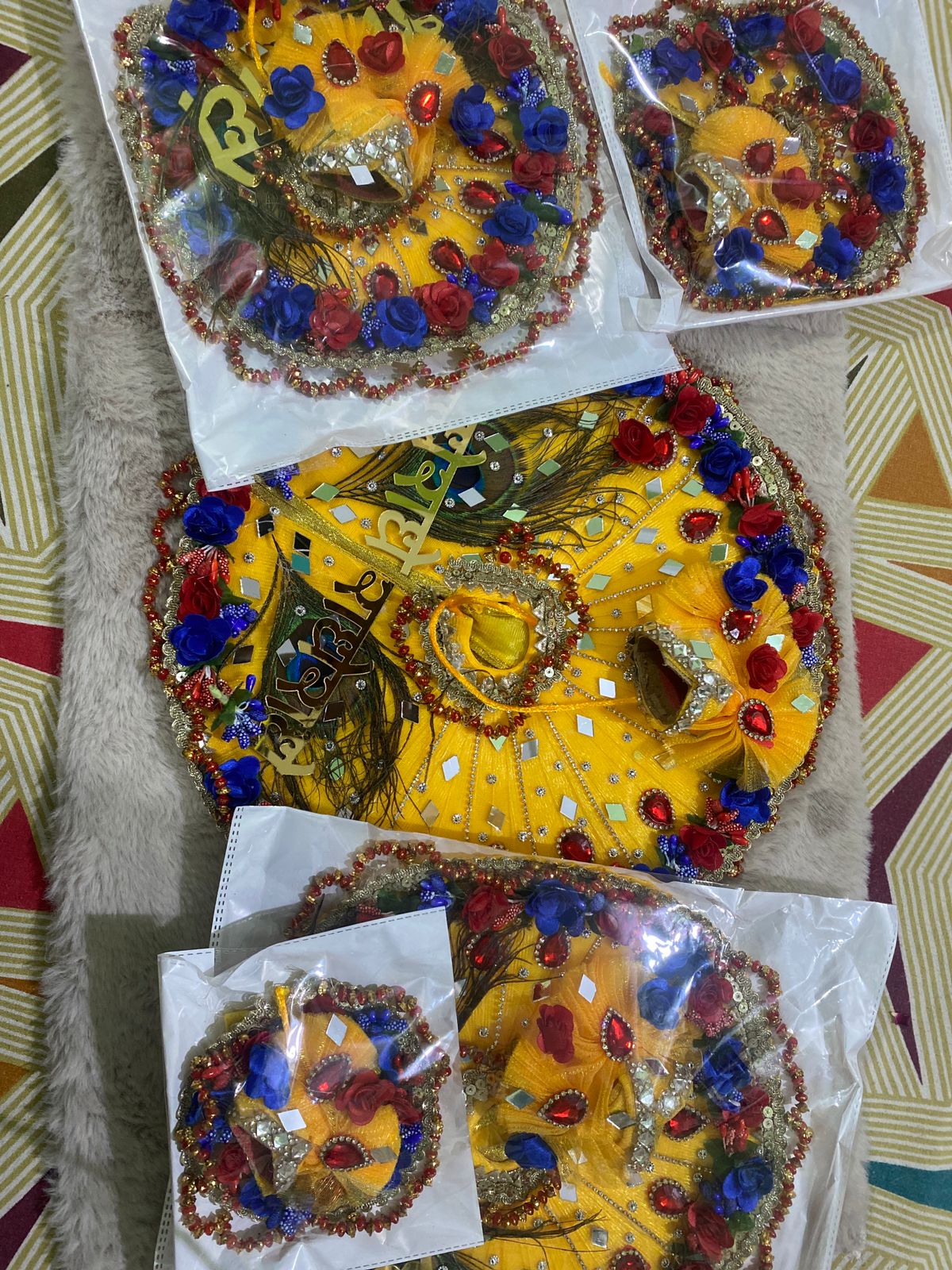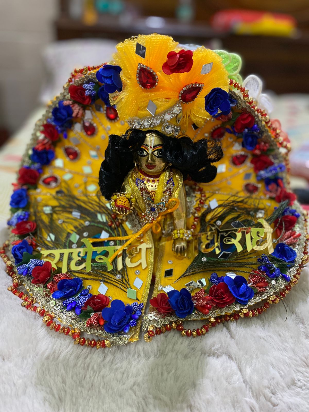 Bring divine radiance to your Kanha Ji idol with this stunning handcrafted poshak set, featuring a vibrant yellow base adorned with sparkling mirrors, red and blue artificial flowers, and intricate beadwork. The circular attire is enhanced with traditional sequin detailing and decorative gems, while elegant peacock feathers and “Radhe Krishna” embellishments add a unique devotional touch. Each set includes a matching mukut (crown) and accessories, making it ideal for Janmashtami, Radhashtami, or daily worship. Made with premium materials for lasting beauty and easy draping, this poshak transforms your home mandir into a haven of devotion and celebration.
